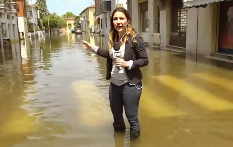 La De Vincenzo peraltro è nota già da tempo per le sue “imprese” spettacolari durante i suoi servizi, basta guardare la foto a corredo di quest’articolo, quando la nostra “giornalista” si è immersa nell’acqua per documentare “al meglio” un’alluvione di qualche tempo fa. Durante quel servizio l’altezza raggiunta dall’acqua era stata ampiamente comprovata dai cineoperatori e dai Vigili del Fuoco durante i loro interventi; ma volete mettere l’immersione fino alle ginocchia della “coraggiosa” cronista per dare meglio l’idea ai telespettatori? Questo si che è uno scoop giornalisticoQuesta sì che è una trovata “intelligente” per aumentare l’audience!